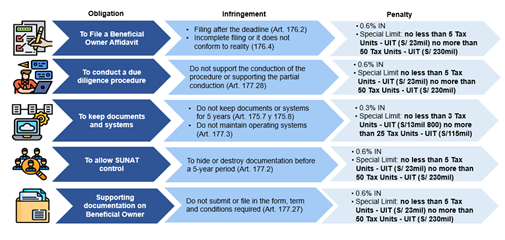 If the obligations related to the Beneficial Owner Affidavit, the due diligence procedure, safekeeping of supporting documentation and systems, and control from SUNAT are not met, the liable taxpayer will incur in penalties detailed as follows: