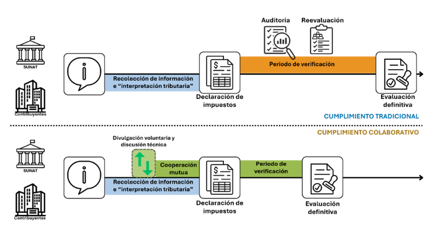 A diferencia del modelo tradicional, el cumplimiento colaborativo pone énfasis en un diálogo constante, y en la gestión proactiva de las obligaciones tributarias, buscando resolver problemas de manera anticipada, evitando disputas o incumplimientos innecesarios. No obstante, no pretende reemplazar al modelo tradicional, enfocado en el control posterior, sino complementarlo.