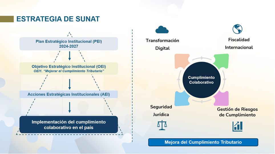Asimismo, en el marco del señalado objetivo estratégico, se ha considerado la acción estratégica institucional “Implementación del cumplimiento colaborativo en el país”, cuya estrategia, siguiendo las buenas prácticas internacionales, se basará en la gestión de riesgos, puesto que permite responder a los incumplimientos tributarios más relevantes con tratamientos diferenciados en función al comportamiento del contribuyente, así como permite implementar con prioridad mecanismos de simplicidad en el cumplimiento de las obligaciones tributarias, principalmente para aquellos dispuestos a hacer lo correcto.