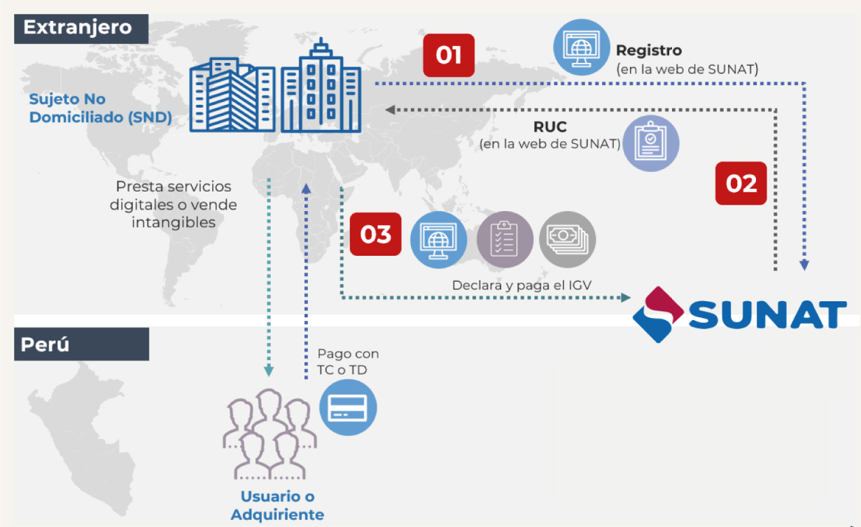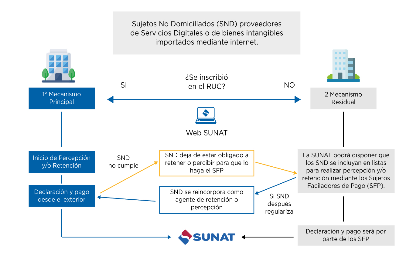 Si bien estas operaciones ya se encontraban gravadas con el IGV, no existía un mecanismo de recaudación efectivo, por lo que para solucionar esta problemática, mediante el Decreto Legislativo N.º 1623 se adaptó el sistema de recaudación del IGV para que los sujetos no domiciliados proveedores de estos servicios digitales y bienes intangibles (SND), sean agentes de retención o percepción del IGV, quienes deberán inscribirse en el RUC, declarar y pagar directamente a la SUNAT a través de procedimientos virtuales, sin necesidad de presencia física, tal como se grafica a continuación: