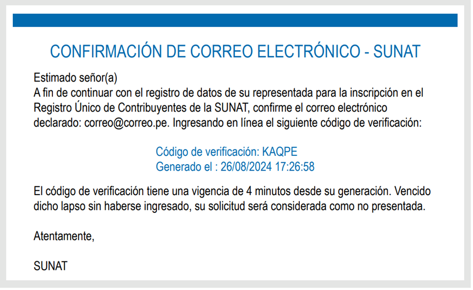 Ingrese el “Código de Verificación” que llegará al correo electrónico del representante legal.