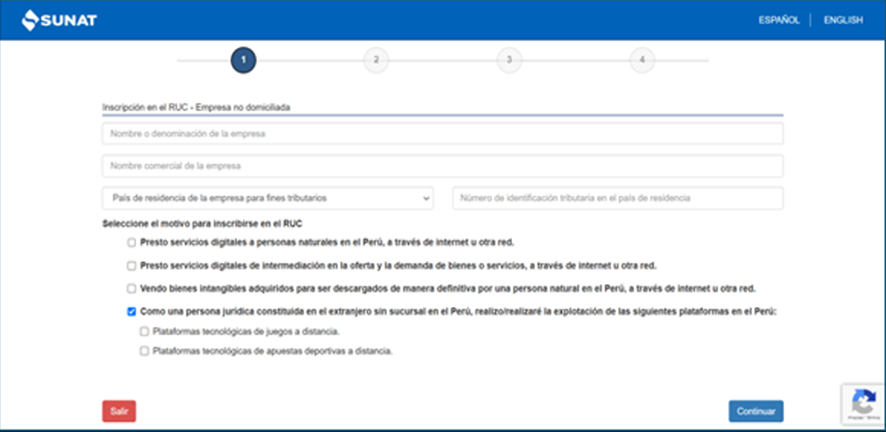 - Ingrese la información solicitada del sujeto no domiciliado y marque la opción de “Como una persona jurídica constituida en el extranjero sin sucursal en el Perú, realizo/realizaré la explotación de las siguientes plataformas en el Perú”