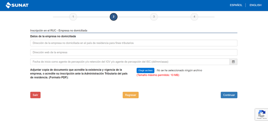 3 ingrese los datos de la empresa y adjunto documento en formato PDF que acredite la existencia ante la Administración Tributaria del país de residencia