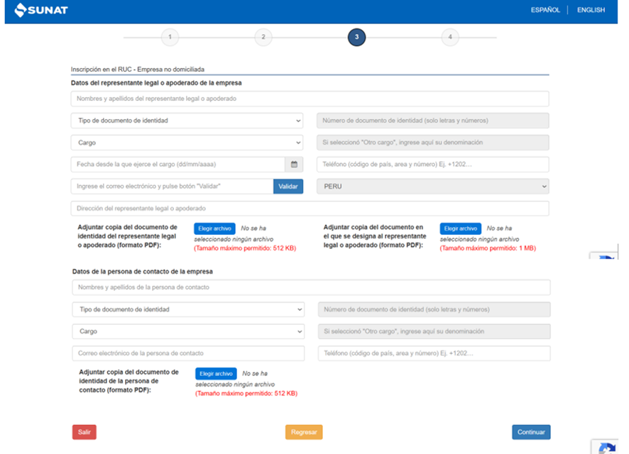 4 Ingrese los datos del representante legal de la empresa y de la persona de contacto, así como adjuntar en formato PDF sus documentos de identidad correspondientes.
