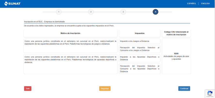 6. Finalmente, se le informará acuerdo a los datos ingresados, que la empresa se encuentra sujeta a los siguientes impuestos en el Perú.