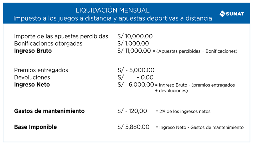 La base imponible se calcula del Ingreso Bruto (IB) que contiene las apuestas percibidas y las bonificaciones otorgadas menos los premios y devoluciones dando como resultado el Ingreso Neto (IN), al cual se le descuenta los gastos de mantenimiento (2% del IN) y se obtiene la Base Imponible del impuesto. (Art 41, Ley 31557).